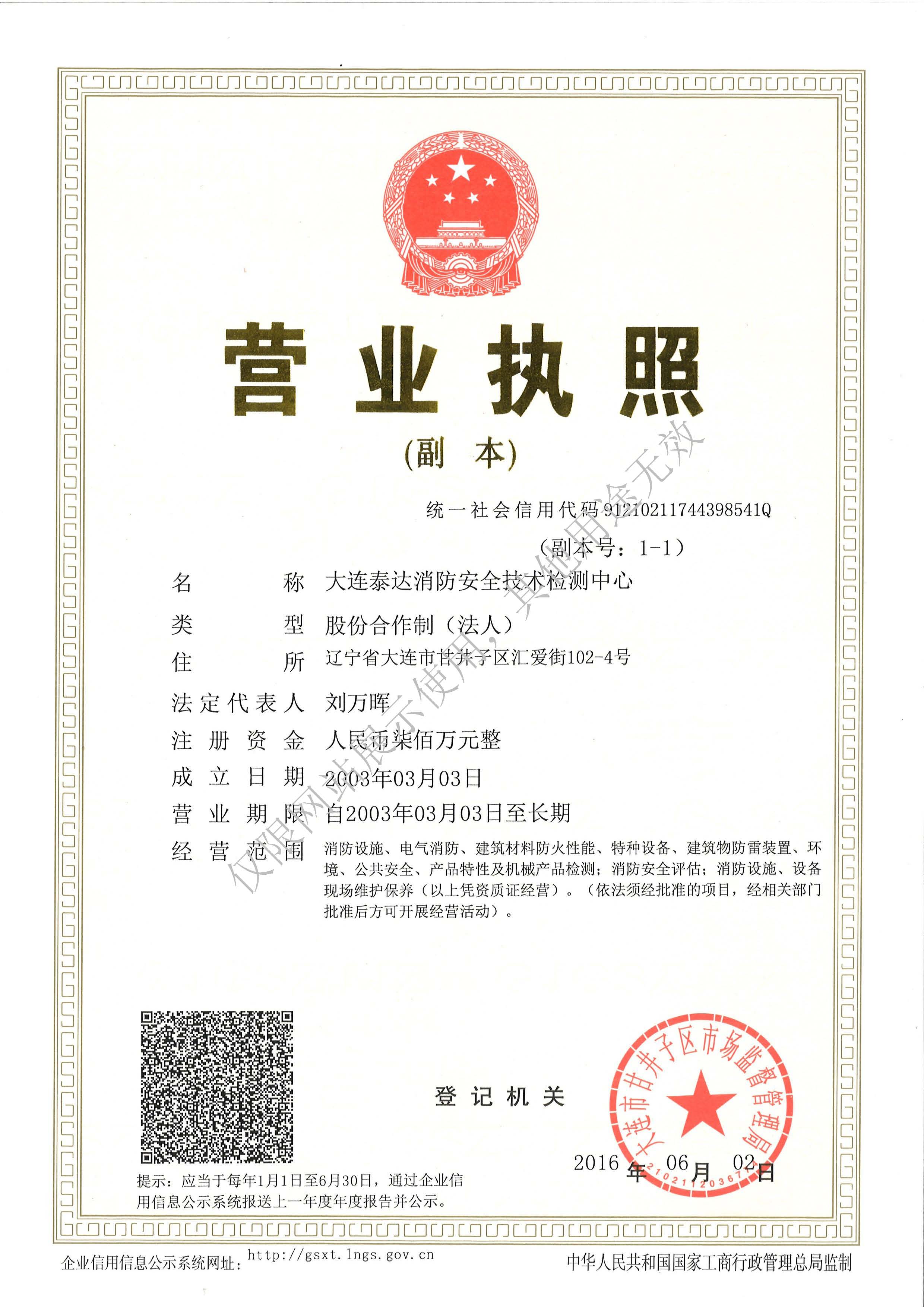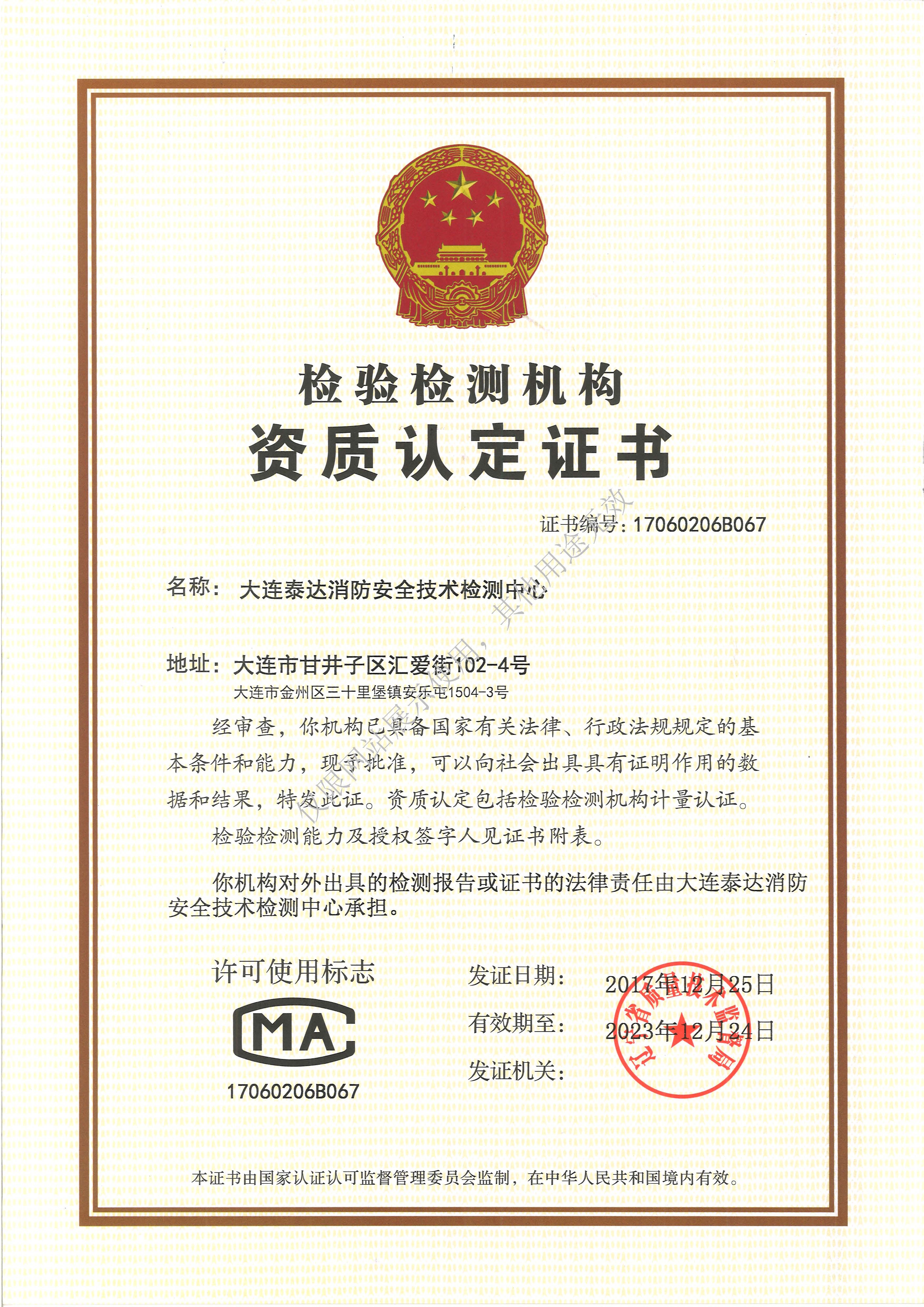 · 是經“社會消防技術服務信息系統”備案并公示的消防技術服務機構,已取得中國氣象局頒發(fā)的雷電防護裝置檢測資質證書、遼寧省質量技術監(jiān)督局審核批準的檢驗檢測機構資質認定證書(CMA)及包括消防檢測、電氣檢測、雷電防護裝置檢測、防火涂層厚度檢測等在內的200余項檢驗檢測能力,取得大連市應急管理局頒發(fā)的安全生產標準化證書,獲得質量管理體系、環(huán)境管理體系、職業健康安全管理體系認證證書,是經備案的高新技術企業,可獨立出具具有證明作用的檢測報告。